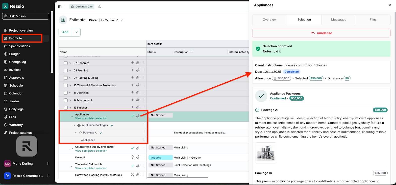 Ressio's Selections feature lets builders assign a due date to every selection and release it to the homeowner for digital approval. The homeowner sees their options with clear pricing, approves with a click, and the budget updates automatically.
